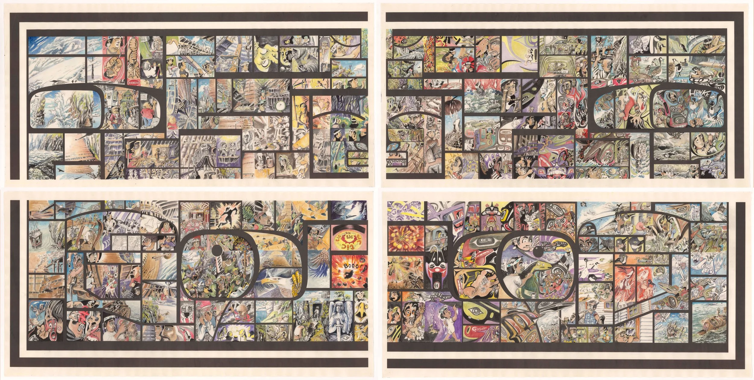 Clan Hat is a multi-year project that was commissioned by and for the permanent collection of the Vancouver Art Gallery. The mural tells the first chapter of a three-part story of MNY’s imagination. It explores the range and quality of relationships that individuals build to create functioning societies and how these structures respond to external challenges.