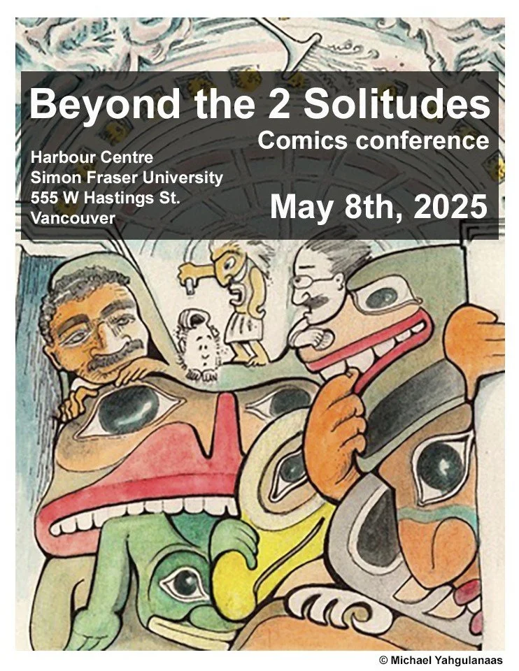 Michael Nicoll Yahgulanaas took part in the conference, Beyond the 2 Solitudes, organized through interdisciplinary and inter-institutional collaboration across Canada. In British Columbia, the conference took place at Simon Fraser University in Vancouver, B.C. Michael Nicoll Yahgulanaas, featured on the poster of the event, was one of the keynote speakers presenting on May 8, 2025.